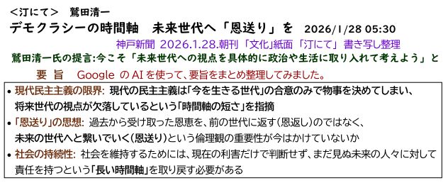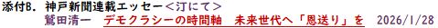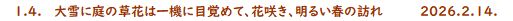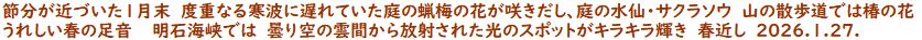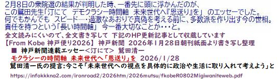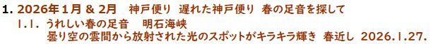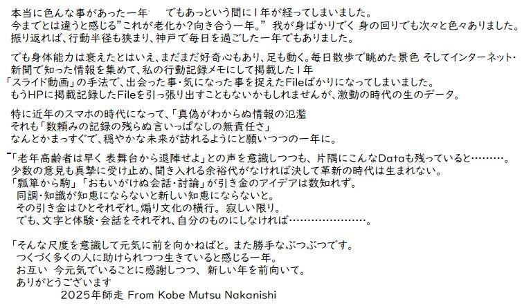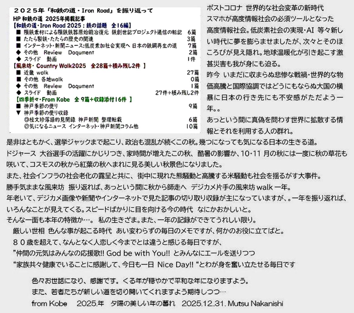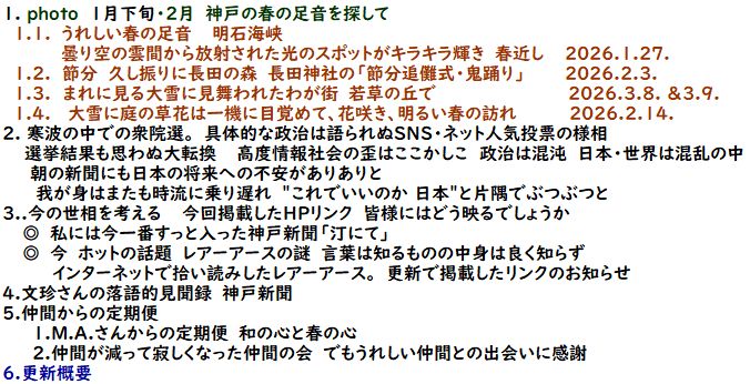 ◎2026年1・2月更新後記 2026年1・2月の更新をやっと終えました。 年の初めから世相は目まぐるしく変化し、 また、地球温暖化による目まぐるしく変わる気候変動と度重なる寒波。 ぐずぐずしている間に毎日の行動記録やweb資料が次々と山済みになって、しまいました。 高齢で迎えた厳しい一年 今の記録を残して置きたくて またずるずるのとりとめのない記事ばかりの更新になってしまいました。 また、2025年1年の更新記録 なにかか腑に落ちないと思いつつ見直していて、