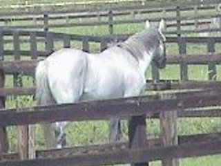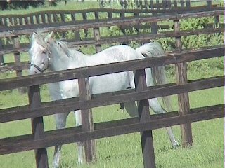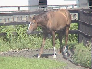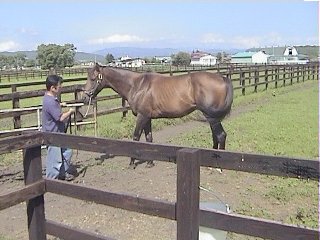 オグリキャップは、遠くで放牧されていて、おまけに遠いほうばかりいるので、台に乗って、望遠でなくっちゃ見れない。