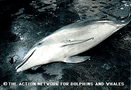 | 1996年10月18日、静岡県伊東市・富戸にてイルカ漁が行われ、総計200頭を越えるバンドウイルカ(上写真)+オキゴンドウの群が富戸港に追い込まれました。現地で調査を行ったイルカ・クジラ・アクションネットワーク(以下I.K.A)のまとめでは、漁の目的は水族館へのイルカ供給と食用であり、追い込んだ中から計32頭を各地の水族館への売却用として選別した後、残るイルカを食用として屠殺、その場で解体し始めました。現地漁協は水産庁及び静岡県より今年度あたり75頭の捕獲割り当てを受けていますが、今回の操業だけで200頭以上を追い込み、明らかなだけでも30頭以上を解体。また、捕獲時にショック死、又は衰弱死した個体も多数いるとのこと(これは捕殺数としてカウントされていません)。I.K.A