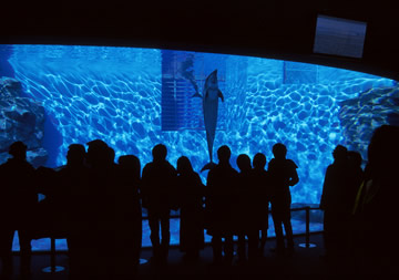 開館前に外部から視察した海洋生物学者ポール・スポング博士が、まるで要塞のようだと評した威容、エントランスをぬけるとすぐに全面アクリルの壁があり、鯨類用の畜養プールの中を一望できるようになっています。照明は落とされ、館内は水面を透過してきた陽光で青く効果的に照らされています。傍らの説明パネルには「シャチ」。しかし現在はバンドウイルカが収容され、所在なく来館者を眺めて過ごしています。頭上のプラズマディスプレイでは野生オルカの生態ビデオ、このほか、標本類や解説テキスト、視覚素材、関連グッズまで、すべてオルカ主役を前提とした展開になっているのにオルカがいない、という状態です。