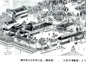 屋敷見取図 この見取り図は明治の中頃 に描かれたもので、右上が南 で左下が北になります。これ を見ると現在は郵便局と接し ている屋敷の北側も、かつて は堀と石垣に囲まれていた事 が分かります。 |