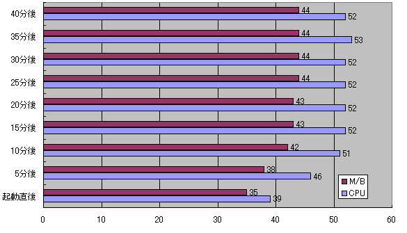 | 温度測定し比較してみました。M/B付属のASUS PCProbe2で測定しました。 起動後すぐに3Dゲーム(Fighter Ace III)を起動して計りました。(ただ単に遊んでいるだけですが・・・) |