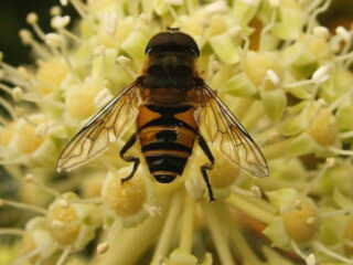 ヤツデの花のみつをなめるハナアブのなかま。鳥に花粉をはこんでもらうツバキは,鳥が見つけやすい,赤い色をしていますが,ヤツデの花は,ハナアブやハエに見つけてもらえればよいので,花びらはありません。