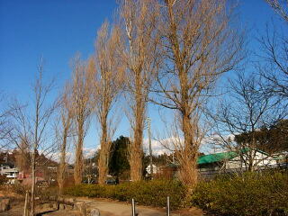 公園のポプラの木。まっすぐ上に伸びた枝。