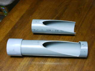 鏡筒の大部分は塩ビ管で作ります。VU50と言う,内径50mmの水道管パーツです。筒の肉厚は2mm。軽い望遠鏡ですから,この程度で剛性は十分でしょう。光路を斜めに折り返すので,塩ビ管を斜めにくり抜く作業が必要になりました。これを手作業で,プラスチック用ノコギリ1本でやろうと言うのだから,ちょっと精度に不安が残りますが,ま,削りすぎたらパテで埋めりゃいいか。