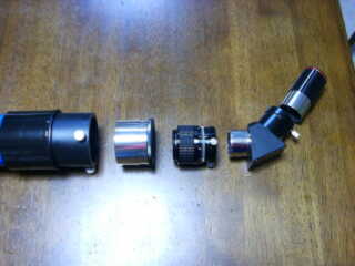 左から,2インチスリーブアダプタ(塩ビ製,自作),2インチ→36.4mmスリーブアダプタにレンズを押し込んだレデューサーユニット,BORG直進ヘリコイドS,45°正立プリズム,プローゼル25mmアイピース。