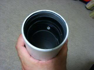 筒は軽量で加工が楽な塩ビ管です。水道管などに使うVU65と言う規格のを使いました。これは内径が67mmほどあります。レンズの直径は62mm(実寸)ですから,塩ビ管の内側に0.5mm厚の黒い塩ビシートを積層し,内径を狭くします。VU65よりひと回り小さい,VU50管用のジョイントが,ちょうど内径60mmだったので,これを薄い輪切りにして艶消し塗装し,レンズ押さえにします。あとは艶消しと固定を兼ねて,植毛紙をベタベタ貼って,対物部が完成です。