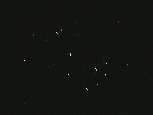 さて,暗い星がノイズといっしょに除去されてしまわないか,ちょっと心配でしたが,けっこう写っていますね。原画では,おおよそ8〜9等星まで確認できました。肉眼では4等星がやっとこ,と言う星空でしたから,かなり健闘しています。星空のバックの明るさを抑えるために,思い切り望遠にして撮影した効果もあったようです。