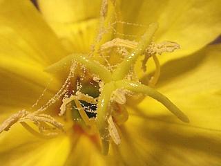 花の中心部のアップ。花粉が糸を引き,おしべとめしべにからんでいるのが,わかります。