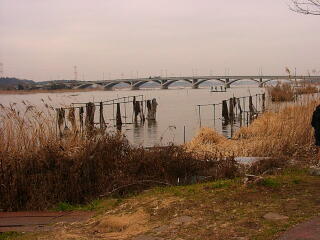親水広場の端のほうから手賀大橋を望む。水が汚くなったとは言うものの,手賀沼では漁業が行われています。