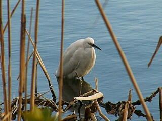 水辺のアシ原の向こうに,コサギが。