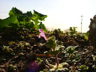 段丘の下の畑の日だまりでは,もう春の花が咲き始めていました。