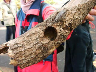 腐って落ちた木の枝に,コゲラの巣穴がありました。キツツキの巣穴を手にとって見るチャンスなんて,滅多にありません。コゲラは体が小さくて力が弱いので,木に穴を開けるときも,枯れかかった木や枯れた幹などを選びます。一般的な公園緑地では,落下すると危ない等の理由で,枯れ枝をすぐに落としてしまうため,場合によっては,コゲラの営巣場所を奪っているようですね。