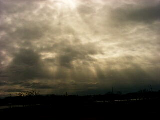 | 雲の隙間から差し込む陽射し。 空気中の水滴やチリによって帯のように光ります。 これも一種の「チンダル現象」。 これを「天使の梯子(はしご)」なんて呼んだりします。 |