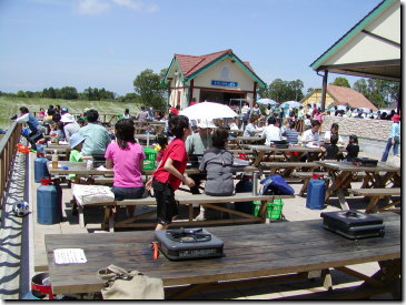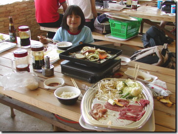 【昼食】 レストランは、カフェテリア形式で食べられるコーナーとバーベキューのコーナーがあります。今回は、バーベキューを利用しました。スーパーで食材を買う感覚で食べたい素材をカゴに入れてレジで料金を払います。ファミリーセットメニューもあり大家族でもお得です。座席の数も結構あるので土・日の混雑している時でも大丈夫です? ※恵太はまだお肉が食べれないのでパンとじゃがいもで我慢しました。 |
