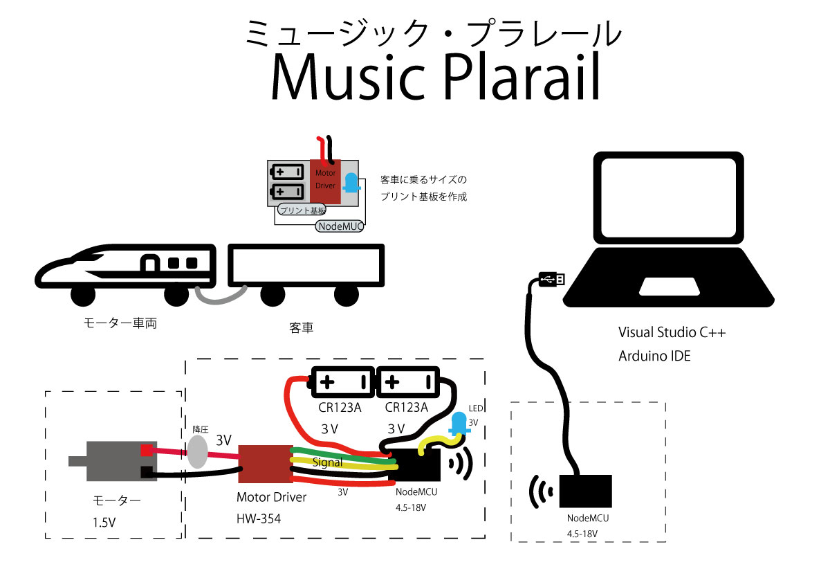 PCに、USB経由で、NodeMCUが接続されています。各車両のモーターにもNodeMCUが接続されています。PCと各車両のNodeMCUはESP