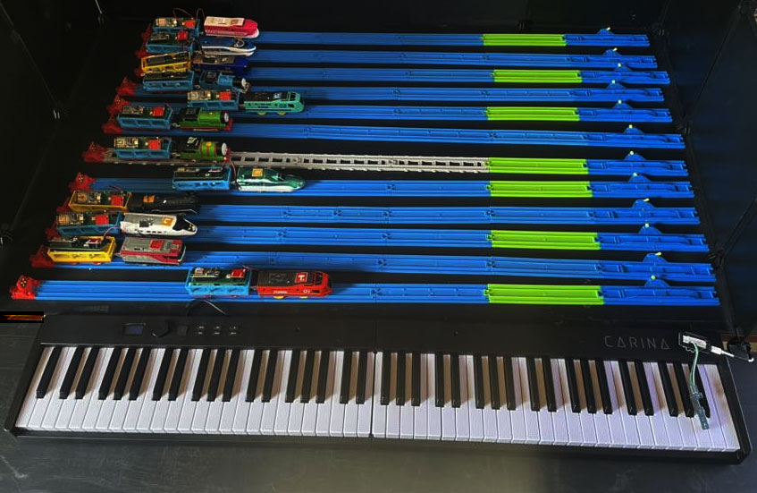 キーボードを弾くと対応する音の車両が前進します。一定時間、演奏しないとスタート地点に戻ります。