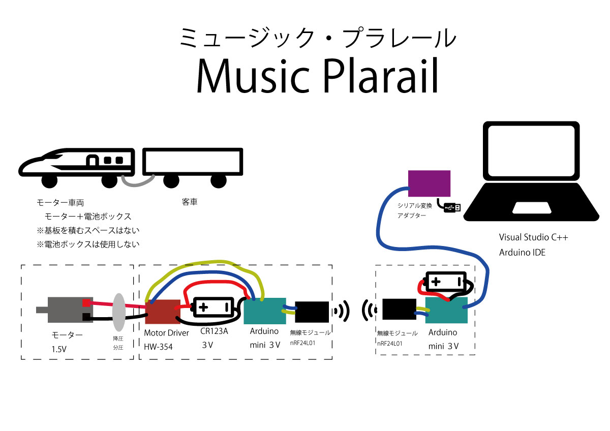 プラレールの車両に積み込もうとすると、かなり小さくまとめる必要があります。試作第1号は、3Vの電池とArduino