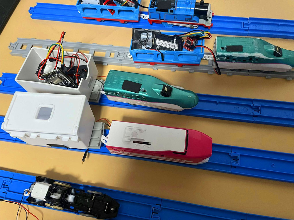 貨車にコントローラと電池ボックスを搭載し、モーター車を配線をいじって、接続しています。 |