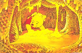 - プーは巣穴に手をつっこむと、みつをすくってなめました。