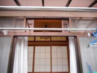 後で簡単に取外しできるように、サッシの網戸のレールにはまる木材(棚の板)を2枚使いました。