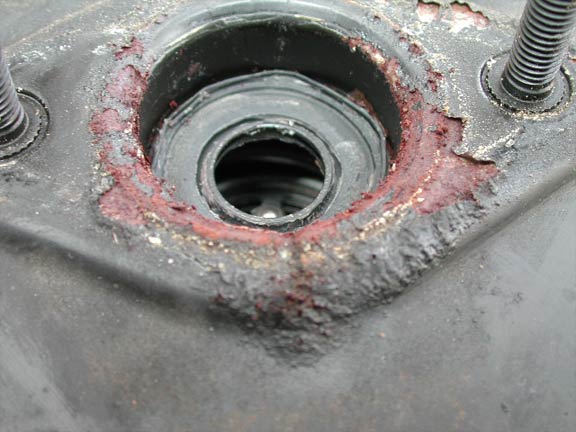 対策品みたいな形をしたものを分解すると、マスターバックの表面にブレーキフルードが垂れるということはなかったのだが、内部には多少漏れた跡がある。これはツインカム用の対策品と同じ傾向だ。