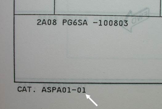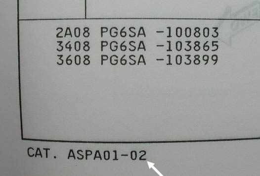 新旧バージョンを比較する。新しい方が脚注に記載されている車台番号が多くなっている。また脚注の見方だが、「2A08 PG6SA-100803」と書かれた部分を見ると・・・パーツカタログの中には「2A08」と追記されている部分があり、PG6SA-100803から部品番号がかわったことがわかるようになっている。