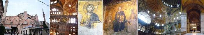 | ■向かいのアヤソフィアに入場する。ガイドブックには10リラとあった入場料はいつの間にか20リラになっていた。4世紀から6世紀にかけてビザンチン帝国の国教であるギリシャ政教の大本山として建造された寺院である。オスマン朝時代にはイスラム寺院に変えられ、共和国になって博物館として一般公開された。入場すると警備員の案内ですぐに石段を上がり2階ギャラリーから見学する。南回廊にはビザンチン文化を象徴する聖母マリアやキリストのモザイク画が残されている。天井を覆う巨大なドームが観る者を圧倒する。回廊手摺りから見下ろす堂内の高さと広がりに驚嘆させられる。 | |
