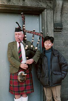 エジンバラ城前でバグパイプを演奏するおじさん。演奏に熱中していて、愛想はあまりよくなかった。 |