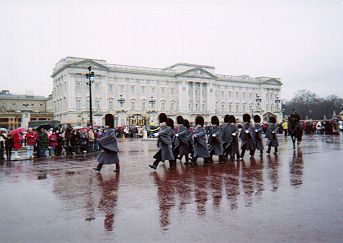 バッキンガム宮殿を警護する、近衛歩兵連隊。赤い上着が有名だが、冬だったので、グレーのコートを着ているのが少し残念だった。 |