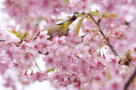 メジロ(8) 動きのある写真を撮ろうとしてメジロが飛んだ瞬間シャッターを押しましたが、私の指の動きよ りメジロの方が遥かに早く、頭が花びらの影に隠れてしまいました。 再度チャレンジします。