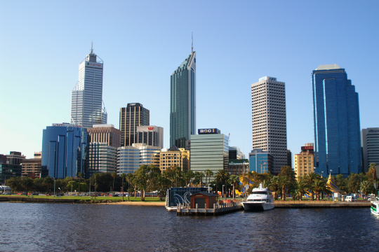 スワン川からパース桟橋越えに見るパース市