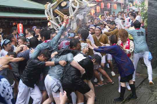 お婆ちゃんの家の前を神輿が通過。「もみ合い」は神輿の醍醐味です。