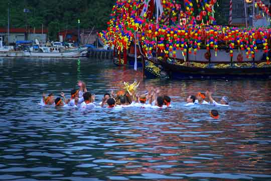 貴 船 祭 り(7) 担いだ神輿を海中でお清め。以前は泳いで対岸まで神輿を運んだようですが、年々規制が厳 しくなってしまい、今年は海に入ったら直ぐに紐を引っ張られて陸に上げられてしまいました。