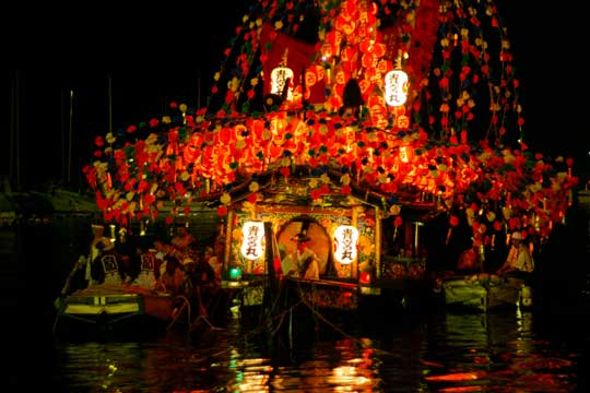 貴 船 祭 り(10) フィナーレ。提灯に灯が入った小早船。東西二艘の櫂伝馬船が東西の小早船を引き、小早船が神輿船 を引きます。その外側を囃子船が賑やかにお囃子を奏でながら貴船神社に向かって海上渡御します。