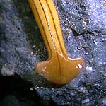 気持ち悪くて、びっくりさせてごめんなさい。 ここ、せせらぎ公園では、先日 「宇宙からの怪獣イモムシ?」 を目撃したばかりですが、じめじめした7月のある日、 またまた違ったタイプの「宇宙よりの使者?」と遭遇しました。 この朝このあたりには、5匹ほどの細長く黄色いネバネバした生物が 地面を這っていて次々に遭遇した。いよいよ地球侵略が開始されたのか? 写真の一匹は、ブロック塀と地面との角にとぐろを巻き、 落ち葉の陰にじっと潜んでいた。 左右 5cm ほどの大きさ。 体は黄色く、ぬめぬめと光り、3本のラインが入っている。 |