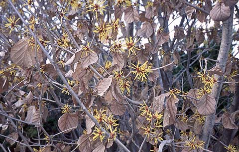 ◆ マンサク、春の一番花 ◆![]() (2001/02/25 撮影 at 近所) 寒く辛い冬の日々が過ぎ、 あぁそろそろ春に向かっているのだなぁとふと感じる、 そんな季節が僕はとても好きです。 そのきっかけとなる花のひとつがこの「マンサク」です。 あまり見栄えのぱっとしない花ではありますが、 僕の日常において、春の一番早い時期に咲き出す花です。 ツンとスパイシーないい匂いが漂っていて気付いたりします。 ティシュペーパーを細く千切って丸めて、 ちりちりと伸ばしたようなそんな感じの花びら。 マンサクという名前は「まず咲く」に由来するらしいです。 この花の後、梅や桃や沈丁花が咲き出すのはもう少し先です。 2002 年には、1/10 にこのマンサクはもう咲き始めていました。 2003 年には、1/16 にはこのマンサクは咲いていました。 2004 年には、1/14 にはこのマンサクは下の方が咲き出していました。 |