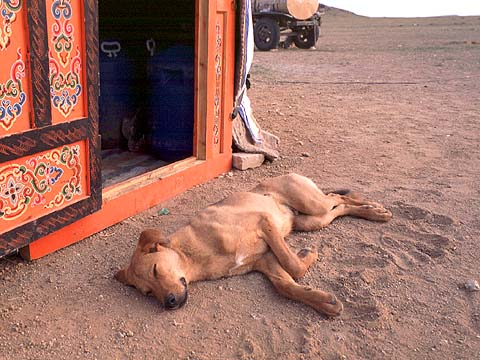 朝、ゲルの前で気持ち良さそうにぐったりと眠っている犬。