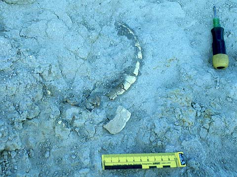 カメの甲羅が見つかった丘。 丘の上から何筋かの白い尾根が続いている。地質はしまった砂。 右の Minew がいる位置でカメ発掘中。 |