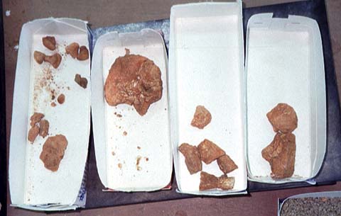クリーニングの途中で出てきた、手指以外の部分の化石骨。 左から2番目の小箱に入っている、大きな丸いのはたぶん肩甲骨でしょう。 ということは、肩から先の骨がひとそろいあったわけです。 右の小箱の骨は二の腕のあたりかな。