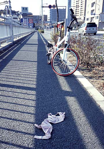 をこいで行くと、 歩道上になにやらピンク色の布きれが。