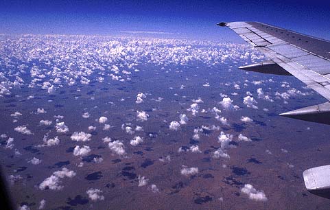 北京から北西に飛んでいるわけだが、緑濃い中国奥地の景色は、次第に 人気が無く、水気の無い砂漠へと眺めを変えていく。まず、草木が 減っていく。緑色が次第に陰影を無くして、そのうち地面は土色のみとなる。 それと対応して、雲が減っていく。緑の草地の上には雲がぽこぽこと 湧いているが、草の生えない地面の上には、雲さえも湧いてこない。 茶色い地面の上には、車の走った線や濁った水たまりがあるが、 それも次第に少なくなり、地層そのままの色がむき出し、という 感じになっていく。