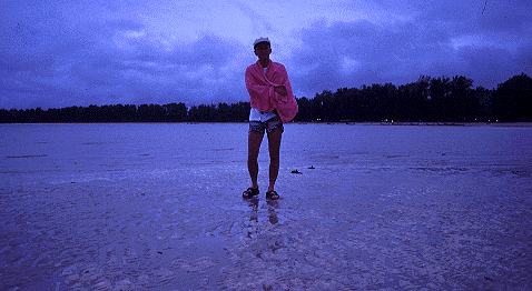 雨は 5 時くらいにやっと小降りになった。 目の前の海は潮がどんどんひいてゆき、遠浅の海が 100m も先まで 陸に変わっている。小屋を出て、現れた陸の部分を歩く。 雨はまだポツポツ落ちてくる。風もあって肌寒いのでタオルを体に 巻いて歩く。 雲は広く空を覆っている。夕焼けにはならず、ただ青暗くなる夜。