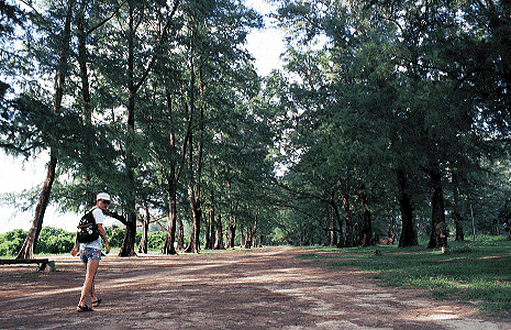 それから、荷物を持って出かける。ビーチに沿って林の中を 通る道を北へ (写真)。道端の草むらを注意して観察。トカゲとか、 またまた変な草花とか、そんなものを写真に撮りながら歩く。 カマキリを期待していたのだけど、それは見つけられなかった。