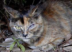 この猫は「カタメ」と呼んでいる。もう4年の付き合いになる。 なんで「カタメ」かというと、出合ってすぐにこいつは左目を ひどく損傷していたことがあったから。 猫同士でのケンカでもしたのだろうか、左目が深くえぐられて、 眼窩に肉が見えていた。 こりゃもうダメかもしれないなーと思ったが、その後回復し、 2ヶ月後にはなんと! 眼の形が再生していた。 野生の生命力のたくましさよ。人間ではこうは行くまい。 水晶体の濁りは残ったが、それも次第に薄れて、今では見た目では ほとんどわからない。視力が回復したのかどうかは怪しい。 (上の写真ではカメラのストロボが反射して左目の奥が光って見えている。) 小柄な猫ながらしっかり居場所を確保して、他の猫たち (だんご尻尾、 グリーンアイ) とも共存し、元気に暮らしている。 |