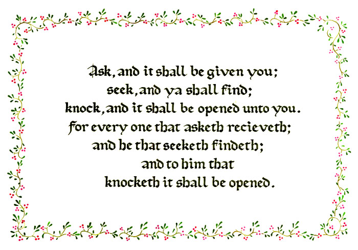 ルタンダ体修了時に作成した作品です。ルタンダ体は比較的古い文字なので題材に聖書の一説を選びました。 この一説は聖書の中で私が一番好きな下りです。多くの先人たちが語ってきた「強き願いは必ず叶う」ということがこの一説に表現されているのではないかと思います。 周りの飾り罫が言葉の内容に対して甘すぎてしまったので、いつかまた違った形でこの一説を作品にしてみたいと思っています。 私はキリスト教徒ではありませんが聖書はカリグラフィーとは切っても切れないもの。読み物として読んでも興味深いものなので、時々読み返したりしています。 |
