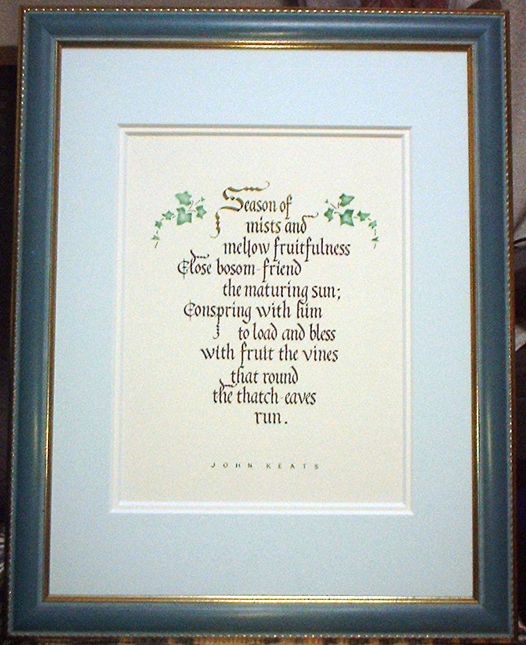 | コメント | この年9月に生れた息子にささげる意味で書いた作品です。また、二作目の作品展出展作品でもあります。「実り多き人生を送って欲しい」という願いを込めてこの詩を題材に選んでいます。画像では少しわかりにくいのですが、葡萄の実をかたどったレイアウトになっています。 |