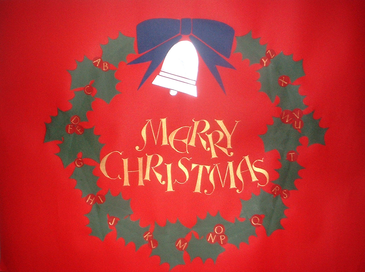 息子が通う英語教室の先生から頼まれて制作しました。柊の実の中に小さい子どもでもわかるようにローマンキャピタル体で大文字のAからZを書き入れてあります。