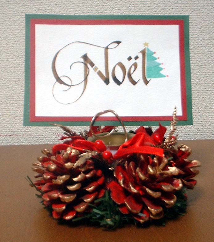 | コメント | クリスマスに飾ろうと思って構想を練っていたミニ作品なのですが、風邪でダウンしてしまったため、完成したのは、クリスマスを通り越し年明けでした・・・。なんとも季節はずれなのですが、悪戦苦闘の末、文字レイアウト(たった4文字ですが)を考えた愛着のある作品なのであえて掲載しました。下のオブジェは100円ショップで購入したキャンドルスタンド+針金でつくった簡易カードスタンドで出来ていて、「気分は栗原はるみ」な作品です。(余談ですが、「すてきレシピ」をvol.2から持っているのが自慢です!今ではvol.1が手に入らないのが悔やまれます) |