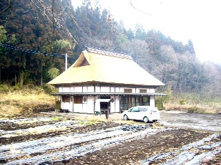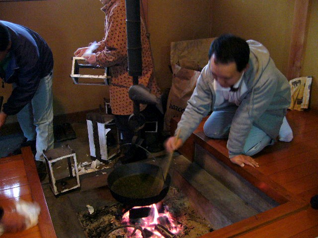 お茶講の家はバス停から3分ほどのところにあった。茅葺きの大きな家である。中では何人かの人間が囲炉裏に当たっている。上がり込んで火に当たらせてもらうと、地元の人のほかにも何人か見学にている人がいることが分かった。 地元の人に話を聞くと、お茶講は元々白久保の集落の家家の持ち回りで行っていたのだが、広い部屋を持つ家が少なくなったため、20年ほど前にお茶候の家を建てたとのことであった。